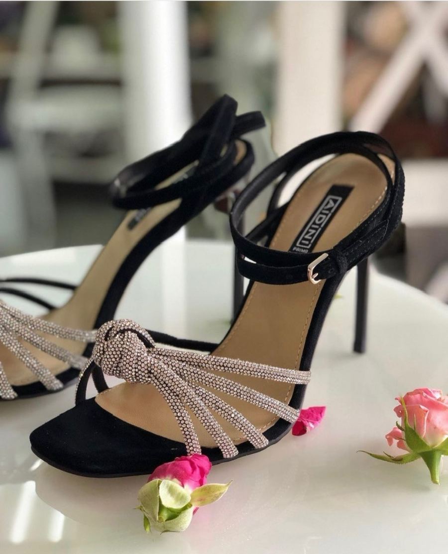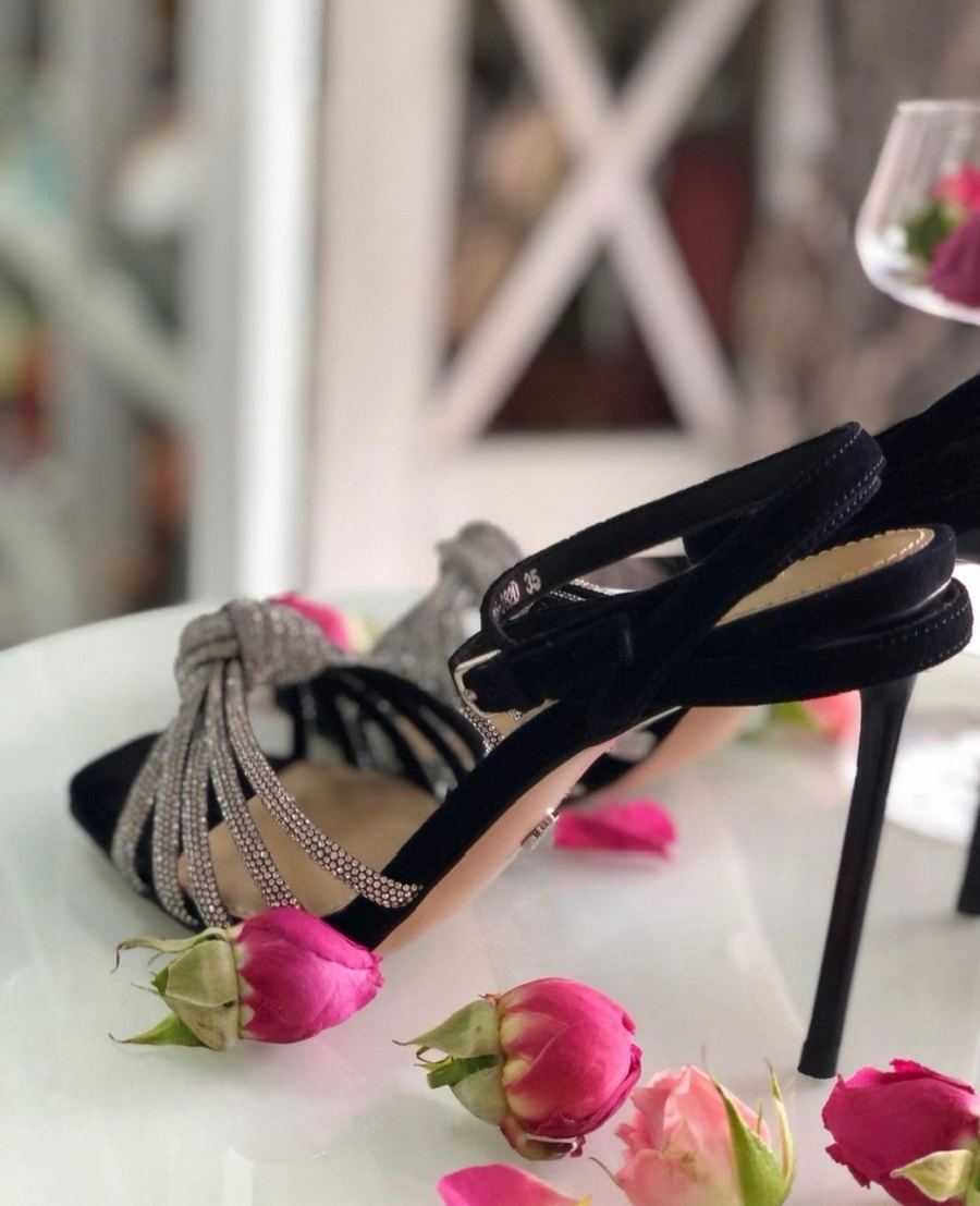 Изящные босоножки на шпильке из натуральной замши со стразами